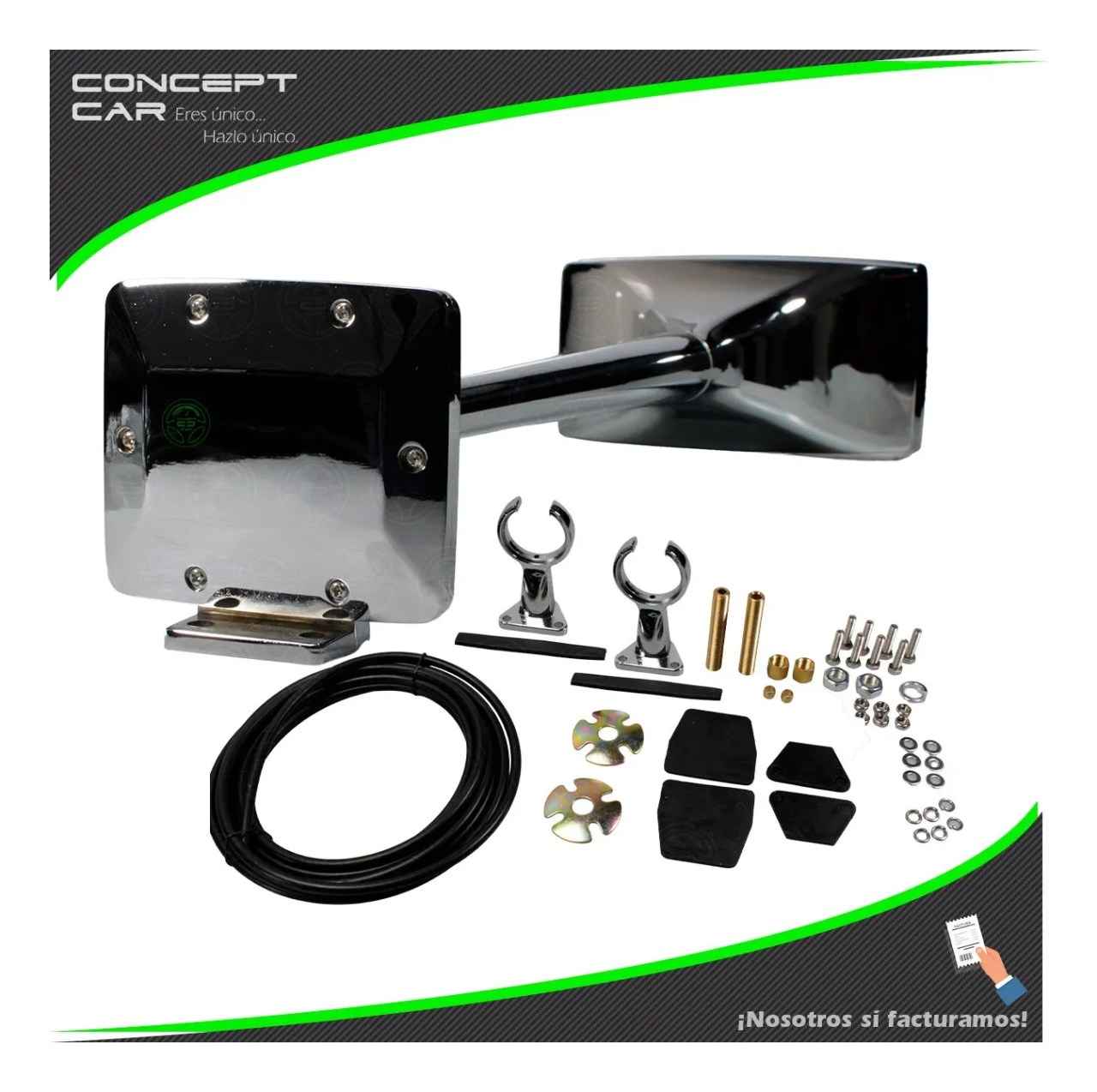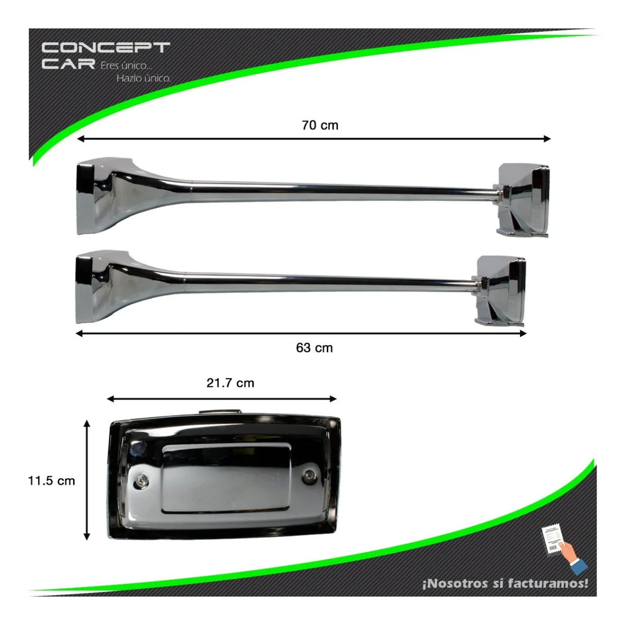 2 Cornetas, 2 bases cromadas, 4 soportes de goma, dos pivotes, dos protectores, una manguera, tornillería, rondanas y sujetadores para su instalación